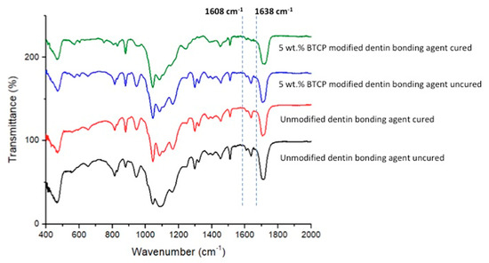 FTIR spectrum of polymerized and unpolymerized unmodified (EA) and βTCP nanocrystal modified adhesive. The degree of conversion was calculated by estimating the changes in peak height ratio of the absorbance intensities of aliphatic C=C peak at 1638 cm−1 and that of an internal standard peak of aromatic C=C at 1608 cm−1 during polymerization, in relation to the uncured adhesive as indicated by dotted lines.