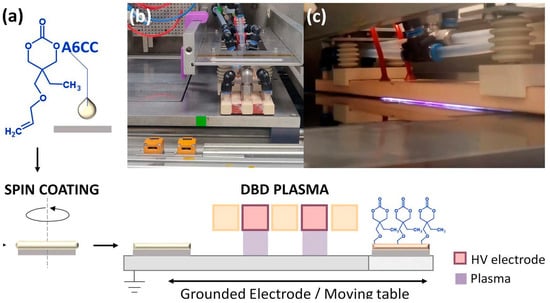 Schematic representation of the process for the atmospheric-pressure plasma-induced polymerization of liquid layers of the allyl ether-substituted cyclic carbonate (A6CC) at room temperature (a). Picture of the DBD applicator over the moving table. Plasma gas is supplied in between the two high voltage electrodes (b). DBD side view with plasma engaged (c).