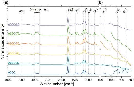 Representative FTIR spectra of the A6CC liquid layers as a function of the number of runs, up to 90, of plasma exposure (power: 1.60 W·cm−2). (a,b) zoom of the bands attributed to the allyl C-C double bond. The spectra were normalized with respect to the peak of the carbonate carbonyl band.
