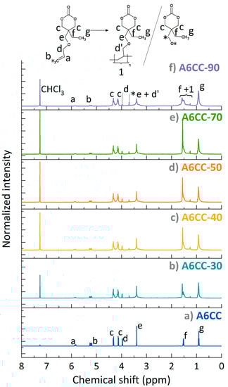 1H NMR spectra (in CDCl3) normalized according to the methylene group (signal g) of monomer (a) A6CC before and after the plasma-induced polymerization. (b) A6CC-30, (c) A6CC-40, (d) A6CC-50, (e) A6CC-70 and (f) A6CC-90. * assigned to the chemical structure shown in the figure.