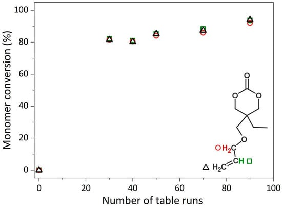 Conversion of the allyl group in function of plasma exposure time (number of table runs) calculated based on the signals from the protons of the allyl group (=CH2, triangle and =CH-, square symbols) and the α-carbon (-CH2-, circle symbol) in the 1H NMR spectra. The integral of the protons of the methyl group were considered as internal reference for the calculation.