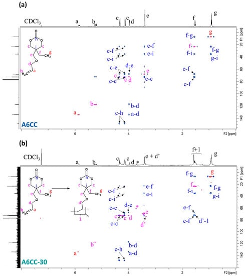 HSQC-HMBC cross-peaks of the (a) A6CC and (b) A6CC-30 samples, where red (odd) and pink (even) contours represent HSQC, and blue contours correspond to HMBC. HSQC reveals carbon–proton interaction, while HMBC shows the interaction between the proton and neighboring carbons. (*) corresponds to the methylene groups of the detected by-product.