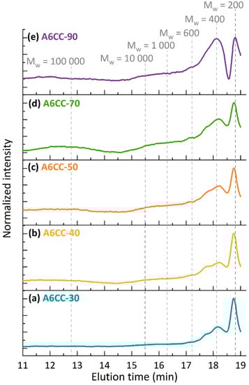 GPC chromatograms of the of the series of A6CC samples in chloroform: (a) A6CC-30, (b) A6CC-40, (c) A6CC-50, (d) A6CC-70 and (e) A6CC-90. For reference, dashed lines indicate the weight average molecular weights of the polystyrene calibration curve.