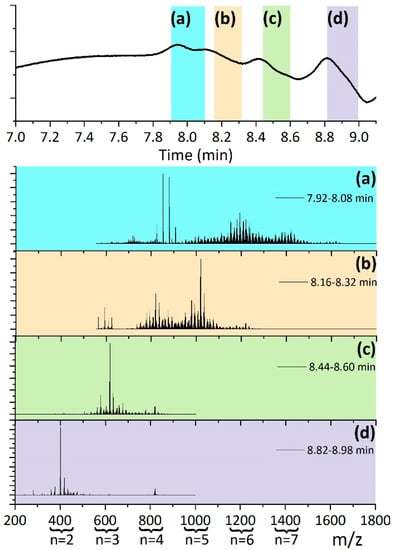 Chromatogram of the A6CC-90 sample obtained by GPC-HRMS. For each elution time range (a) 7.92–8.08 min, (b) 8.16–8.32 min, (c) 8.44–8.60 min and (d) 8.82–8.98 min the corresponding HRMS spectrum is displayed. The ranges are indicated by color bands in the GPC chromatogram. For reference, the number of repeating units (n) of the detected oligomers is given.