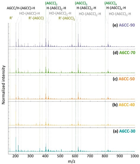 HRMS spectra of plasma-induced polymerization of A6CC in the mass range m/z = 150–1000 of (a) A6CC-30, (b) A6CC-40, (c) A6CC-50, (d) A6CC-70 and (e) A6CC-90. The data plotted are the result of the average spectra between 5.5 and 11 min, and the spectra were normalized to the monomer signal [A6CC + H+]. The mass peaks resulting from the oligomer formation are indicated by dashed lines, where the color corresponds to the structures shown in Figure 9. The exact m/z values assigned to these structures are listed in Table S1.