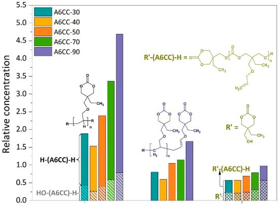 In this study, only the main peaks and isotopic patterns detected in the HRMS spectra were addressed. For each polymerization time, Figure 8 shows the average mass spectra of all the eluted samples, while the m/z values for the most relevant peaks are summarized in Table S1. In all the spectra, the ionized adducts of the monomer chemical structure (m/z: 201.113 H+ or 218.139 NH4+) were detected, and the signal was used to normalize the spectra. In spite of all the combinations that were assayed considering the potential fragments from a single σ-bond breakdown and the mass of the A6CC repeating unit, most of the masses detected with higher intensity could be correlated with the ionized adducts of oligomers of different degrees of polymerization (n) with structures [H-(A6CC)n-H + H+/NH4+], [H-(A6CC)n-CH2CH=CHOCH2(C6H9O3) + H+/NH4+] and less abundant [H-(A6CC)n-OH + H+/NH4+] (as shown in Figure 9). While the unexpected high detection of oligomeric species with hydrogen atoms as the initial end group, thus suggesting the chain growth was initiated by a hydrogen radical, will still need to be properly addressed, the combination of the sensibility of allyl monomers to undergo hydrogen abstraction and the ability of plasma to abstract hydrogen atoms, including from allylic carbons by DBD plasma [], might play a significant role. Otherwise, the detection of oligomers with hydrogen atoms as a terminal end group might reflect the occurrence of chain transfer, characteristic from the well-known allyl polymerization mechanism. Oligomers with the -CH2CH=CHOCH2(C6H9O3) end group could be related to the structure of the monomeric allyl radical, resulting from the hydrogen abstraction either by chain transfer reaction or by plasma-induced fragmentation. The contribution to the plasma polymerization of oxygen and water from the atmosphere, because of the open-air configuration of the plasma reactor, could be the origin of the detection of hydroxyl terminated oligomers. The relative concentration of each of these oligomeric structures to the A6CC monomer are plotted in Figure 9 for each polymerization time. As expected, and in agreement with NMR and GPC results, the detection of oligomeric species increases with the increase in plasma exposition time. The distribution of their structures does not seem to be affected by the number of runs under plasma. The abundance of [H-(A6CC)n-H + H+/NH4+] oligomers is around 2.5 times higher than their [H-(A6CC)n-CH2CH=CHOCH2(C6H9O3) + H+/NH4+] counter parts. Otherwise, the incorporation of hydroxyl groups seems to increase with the plasma exposition time, i.e., longer periods exposed to the atmospheric air.