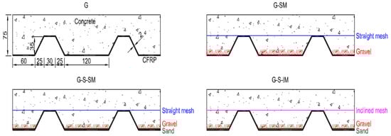 The labeling of the samples describes the connection system and the numbering of the specimens. Numbers at the end of the labeling (1 or 2) define the specimen repetition. Letters define the connection system: G- for bonded gravel particles; G-SM for the combination of bonded gravel particles and straight (0°) oriented glass fiber mesh; G-S-SM for the same as G-SM with the addition of sand particles to the gravel ones; and G-S-IM for the analogous case but with the mesh oriented at 45° with respect to the CFRP sheet nerves. The variety of specimens is defined in Table 1. All were 2000 mm in length, 400 mm in width and 75 mm in height. Figure 2 shows the different connection systems.