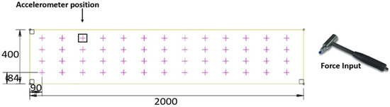Specimens were placed as a simply supported beams with a free span of 1800 mm. Tests were conducted using impulse excitation based on ISO standard 7626-5 [31]. An impact hammer was used to excite the structure at different points (52 points, see Figure 3) controlling the applied force for long periods, whereas a uniaxial accelerometer was used to register the acceleration caused by impacts on a fixed point (Figure 3). The procedure followed a multiple-input, single-output (MISO) approach. Transient time weighting was used to acquire impact data, and exponential time weighting was used to acquire acceleration data, excluding the response forced by the hammer during the impact time, and using only the free vibration data. This strategy was successfully used for the analysis of CFRP reinforcement on masonry walls in previous research [32], where the full post-processing procedure was further detailed.