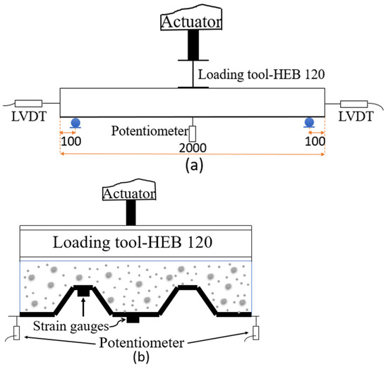 Three-point bending tests were performed on simply supported specimens to assess their performance with regard to bending and shear concomitance. Figure 4 shows the test set-p from the longitudinal (a) and transverse view (b). The free span was 1800 mm and the slab was simply supported on 50 mm diameter steel rollers. The load was indirectly applied using displacement control at a rate of 1 mm/min until failure. An oleo-hydraulic actuator of 50 kN force range and 150 mm displacement range equipped with a load cell and an LVDT was used for this purpose. A steel HEB120 profile was used as a loading tool to distribute the load along the slab width. The vertical displacement was also externally measured in the middle span cross-section with two 100 mm range 0.2% linearity potentiometers set at each side. In addition, two external LVDTs with a 20 mm range were used to precisely measure the relative displacement between the CFRP sheet and the concrete block at each slab end. These were supported on the CFRP edge and measured the relative movement of the concrete block with respect to this edge of the CFRP sheet. Finally, two strain gauges of 350 ohms resistance connected with a 4-wire configuration and temperature-compensated for composites were installed on the external face of the CFRP sheet at the mid-span position and at two different heights, as observed in Figure 4b.