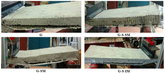 Regarding the applied load, it is clear that incorporating a mesh (G-SM, G-S-SM and G-S-IM vs. G) allowed the slabs to withstand a residual strength after reaching the maximum peak and the corresponding load drop (see Figure 6). Hence, the novel connection proposal of including a flexible mesh had a positive effect, providing CFRP–concrete partial interlocking, even after a connection failure. This residual strength was greater for G-S-IM specimens (between 3 kN and 5 kN), supporting the idea that inclined mesh configuration brought more quantity of fibers to simultaneously collaborate even after the global failure of the structure. This fact translates to the practical implication of providing additional post-failure strength, so increased safety margin. Regarding the sand particles, it can be observed from the modal analysis (see Table 2) that incorporating them caused a decrease in the load-bearing capacity (G-S-SM vs. G-SM) that was also translated into a lower vibration frequency. However, it must be noted that, in the G-S-SM case, the slope of the force–displacement curve after the peak load was slightly positive, thus showing a weak hardening behavior and a partial recovering of the supported load. Moreover, the load drop in the G-S-SM case was less significant than in G-SM, which was approximately a 70% slighter drop. In summary, it seems that the inclusion of sand caused a premature partial failure of the connection, which remained with enough capacity to increase the withstand load again. In comparison, other connection types using mesh (G-SM and G-S-IM), in which the breaking damage was more extensive when occurring, showed a greater load drop and avoided the possibility of increasing the resisted load when increasing the displacement after the maximum load.