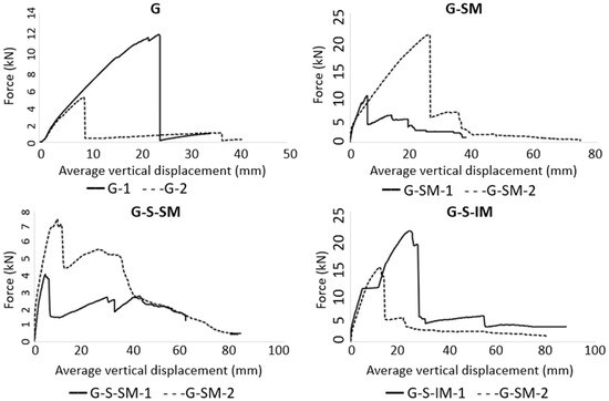 Plots representing the force–vertical displacement response for all the tested cases are shown in Figure 6. Vertical displacement data were obtained by averaging both external potentiometers in the middle span. All the plots show a similar response characterized by a stiffer first linear part up to the first crack opening (approximately 2 kN of force), and a second part which is non-linear and captures the concrete cracking process and the progressive disconnection between the CFRP and concrete up to the maximum load. Subsequently, some cases showed a post-failure response with a clear load decrease. The lowest load-bearing capacities were related to the G-2 (4.87 kN) and G-S-SM-1 (8.0 kN) specimens, whereas the largest resistance was shown by the G-S-IM-1 (21.3 kN) and G-SM-1 (20.8 kN) specimens. Residual load-bearing capacity after failure is between 1 kN and 5 kN for all cases. This value is slightly higher for the cases including fabric connector and the greatest residual strength was registered for the cases with inclined mesh configuration (G-S-IM).
