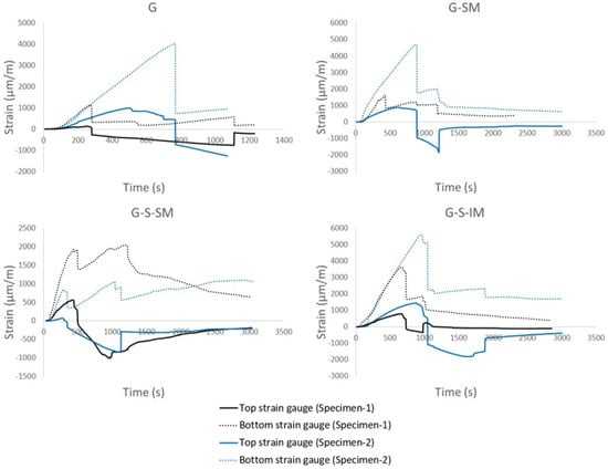 The plots gathering the strain–time results of all tested specimens are displayed in Figure 7. Strain data were obtained directly via top and bottom strain gauges which were installed under the slab in the middle span (Figure 4b). The G-SM-1 top strain gauge measurements were not correct due to an incorrect adhesion of the strain gauges, so these were discarded. In all plots, the trend is linear-incremental for all strain gauges up to the maximum load. It can be observed that, initially, both the top and bottom strain gauges performed in tension until a certain point, corresponding to the maximum load and the specimen failure, from which the top ones started to show compressive strain. This fact indicates that the neutral axe may have moved from a position over the CFRP thin sheet to a position on the CFRP sheet height. Finally, at the end of the tests, the tensile bottom strain measurements were lower in accordance with the lower applied force. Maximum compressive strains were between 1000 με of G-S_SM cases and 2000 με of G-S-IM-2. It can be noticed that G-S-IM-1 case showed tensile strains at the top strain gage after maximum load. This fact proved the further contribution of the full CFRP section to resist the applied bending moment and justifies the second maximum peak of the load–displacement curve (Figure 6).