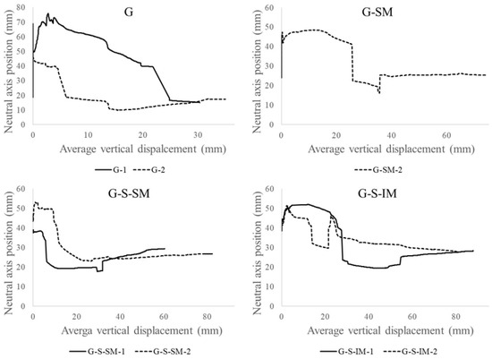 Figure 8 includes the neutral axis vs. vertical displacement at mid-span plots. As per the previous section, the vertical displacement was calculated with the average data from both external potentiometers. The position of the neutral axis was calculated from the measurements of the two strain gauges and by imposing the hypothesis of strain compatibility to the section. As previously indicated, the top strain gauge of the G-SM-1 specimen had no useful values, and it was not possible to calculate the position of the neutral axis for this case.