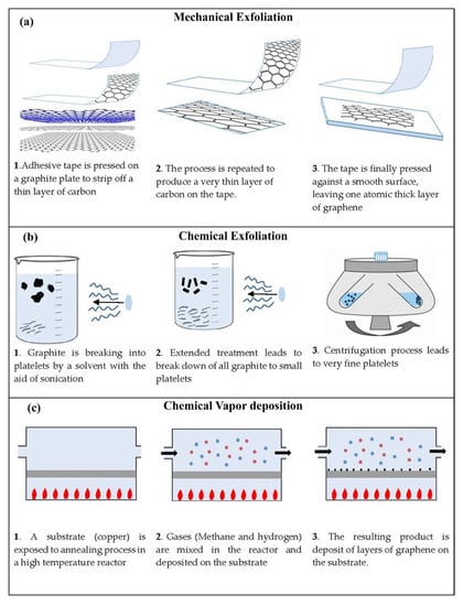 There are several approaches available to produce graphene (Figure 2). These techniques are: mechanical exfoliation, liquid-phase exfoliation, and chemical vapor deposition (CVD). These techniques could be grouped into two categories, i.e., bottom-up (CVD) and top-down (exfoliation methods) processes. Each technique has distinct advantages as well as limitations depending on its intended application. A brief description of these techniques follows.