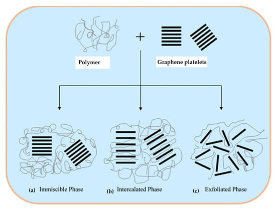 Depending upon the degree of dispersion of the nano-sized layer structure, polymer composites can be divided into three main categories: microcomposites, intercalated nanocomposites, and exfoliated nanocomposites [,,]. In the microcomposites’ structure (Figure 3a), graphene sheets are dispersed inside the polymer matrix in the form of particles and the graphene platelets remain intact. When individual polymer chains are introduced between graphene layers, intercalated constructions are obtained (Figure 3b). In the exfoliated hybrids (Figure 3c), graphene layers are homogenously dispersed in the polymer matrix. The exfoliation configuration is the preferred morphology for nanocomposites as it maximizes the area of contact between the polymer and the filler and results in stronger bonding, and remarkable mechanical properties [].