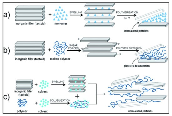 Synthesis of nanocomposites (a) in situ polymerization, (b) melt processing, and (c) exfoliation adsorption. Adopted from [] (CC BY).