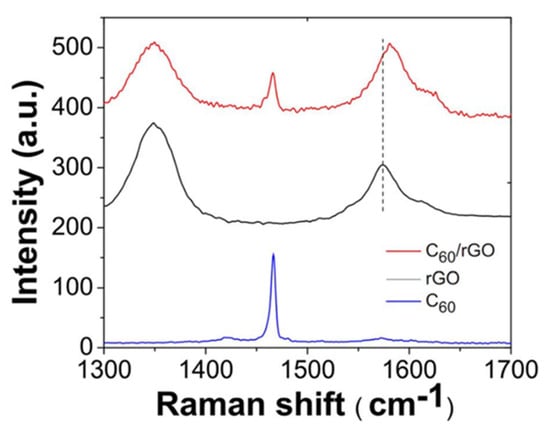 Raman spectra of C60, rGO and C60/rGO hybrid. Adopted from [] (CC BY).