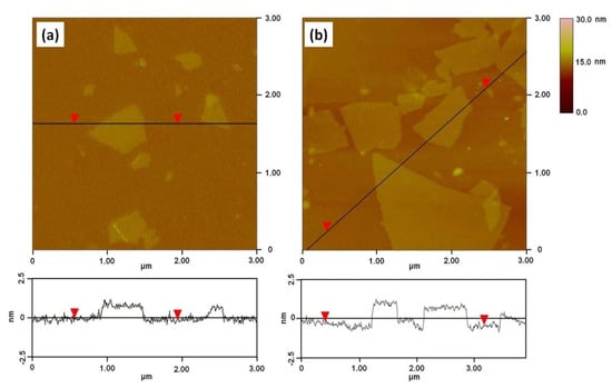 Atomic force microscopy (AFM) images and cross-sectional analysis of (a) GO and (b) S-rGO [] (CC BY).