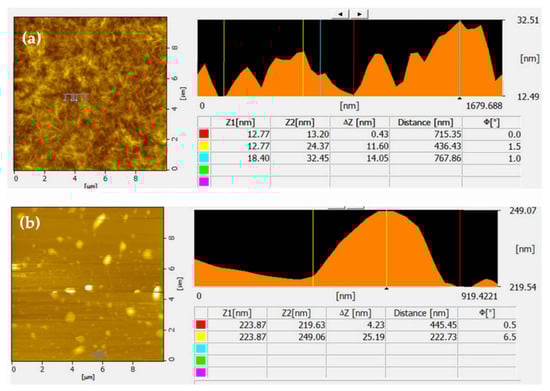 Characterization atomic force microscopy images of (a) graphene oxide and (b) bacterially reduced graphene oxide [] (CC BY).