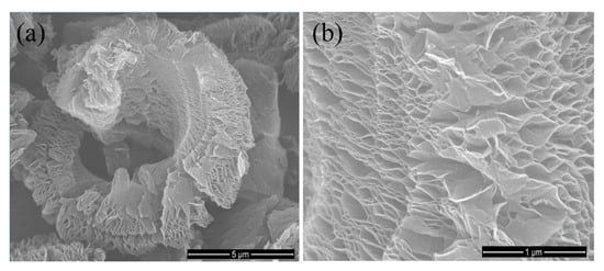 SEM images of reduced graphene oxide (rGO). SEM images at (a) low and (b) high magnification [] (CC BY).