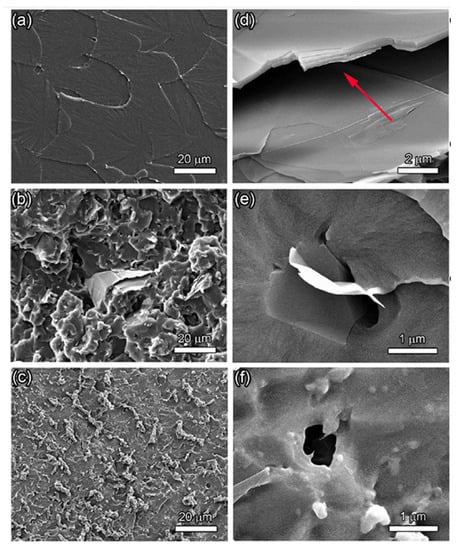 Mechanical characterization and morphology of 1.0 wt.% graphene–epoxy composites. (a–c) SEM images of fracture surfaces of epoxy resin, ultrasonic treated nanocomposites, and the (HP and ultrasonic) treated nanocomposites, respectively. (d) High magnification image of graphene block in (b) The big gap between the graphene sheets, as indicated by the arrow in (d), implies that the graphene sheets slide over each other during the bending test. (e,f) High magnification images of wrinkled and bridging graphene in (c). Reproduced with permission from Nature Publishing group [] (CC BY).