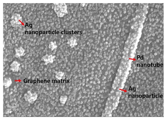 Graphene is quite a robust material in hydrogen sensors due to a possible improvement of its surface area and susceptibility of its electronic properties to the changes caused by adsorbing atoms and molecules including hydrogen. However, the pristine graphene sensitiveness to hydrogen is limited []. Sharma et al., developed a dual FET hydrogen gas sensor using graphene decorated Pd-Ag alloy nanoparticles for H2 detection []. Figure 12 shows the SEM image of the graphene–Ag–Pd nanocomposites on the sensing area of the sensor platform. The integration between graphene, Pd and Ag can be visualized from the SEM image. Ag nanoparticles with the size of Ca. 17 nm and Pd nanoparticles at the size of Ca. 100 nm are uniformly and compactly embedded on the graphene layer. The morphology and nature of the Pd–Ag films grown on the graphene substrate are clearly shown in Figure 12.