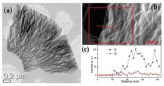 (a) HRTEM images of the RGO stack. (b) EDS line-profile showing the functional groups on RGO, and (c) relative signals of C and O from the EDS line-profile image [] (CC BY).