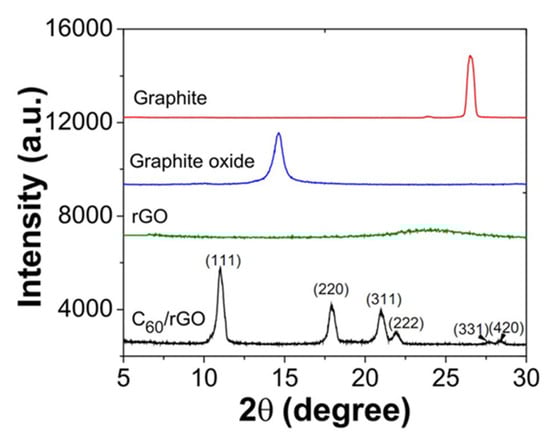 Polymer-based thermoelectric materials have been the focus of many studies for the past 10 years [,,,,]. Zhang et al. [] prepared thermoelectric polymer composite by functionalized graphene with fullerene (C60), and then dispersed fullerene in the polymer. The XRD of graphite and C60/rGO are shown in Figure 15. The XRD pattern of graphite shows a characteristic peak at 2θ = 27°. After oxidation, the graphitic peak shifts to 14.6°, demonstrating that the interlayer spacing increased. After chemical reduction, the graphite oxide peak disappeared. It was suggested that the sharp peak is attributed to the exfoliation of layered structures of graphite oxide []. The XRD pattern also clearly indicates that fullerenes (C60) had been effectively integrated into the surface of graphene.
