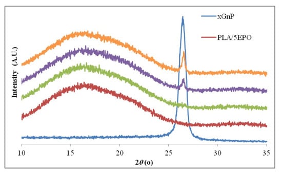 Chieng et al. [] prepared nanocomposite by blending poly(lactic acid) (PLA)/epoxidized palm oil (EPO) with graphene nanoplatelet (xGnP). The PLA/EPO/xGnP green nanocomposites were characterized by XRD. Figure 16 displays the XRD spectra of xGnP, PLA/EPO and PLA/EPO composite with different xGnP loading. The xGnP displays a strong peak at 2θ = 26.4°. The XRD spectra of PLA/5EPO blend and PLA/5EPO with different xGnP loadings display a broad characteristic peak of PLA matrix at 2θ = ~16°. PLA/5EPO nanocomposites with 0.3 wt.% xGnP loading display a small peak around 26.5°, which corresponds to the characteristic peak of xGnP.