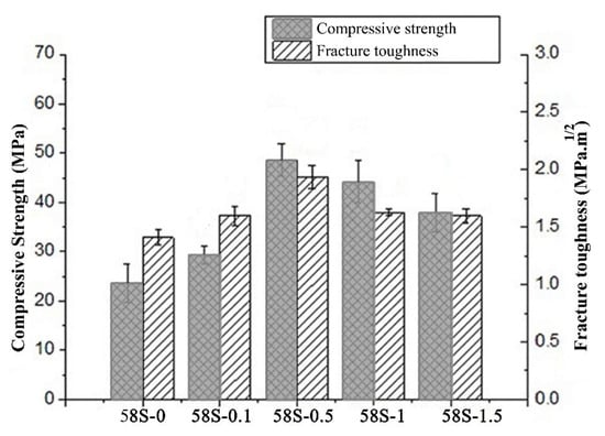 - Gao, C.; Liu, T.; Shuai, C.; Peng, S. Enhancement mechanisms of graphene in nano-58S bioactive glass scaffold: Mechanical and biological performance. Sci. Rep. 2014, 4, 4712. [Google Scholar] [CrossRef]