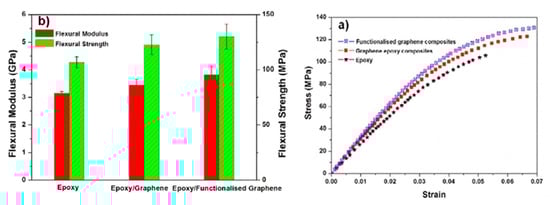 Graphene-based nanocomposite materials exhibit significant improvement in mechanical properties compared to the standard composites [,,,,,]. Graphene has been commonly used to strengthen mechanical properties of several nanocomposites [,]. For example, the tensile strength of the baseline epoxy was enhanced by ~40% with graphene platelets with addition of a very small weight % of graphene (~0.1 wt.%) []. The inclusion of nanoparticles within the matrix enhances linking of polymer chains (crosslinking density) of the nanocomposites and resulted in a remarkable improvement in the mechanical properties. These properties are mainly correlated to the number of graphene layers and the interior defects of the graphene structure. For example, monolayer graphene sheets exhibit excellent mechanical properties (E ~ 1 TPa and strength ~ 130 GPa) [].