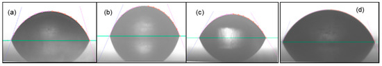 Water droplets on the coated surfaces for the determination of the contact angle of (a) PU-TDI-PPG-1000, (b) PU-TDI-PPG-2000, (c) PU-TDI-PPG-2000 and (d) blocked isocyanates.