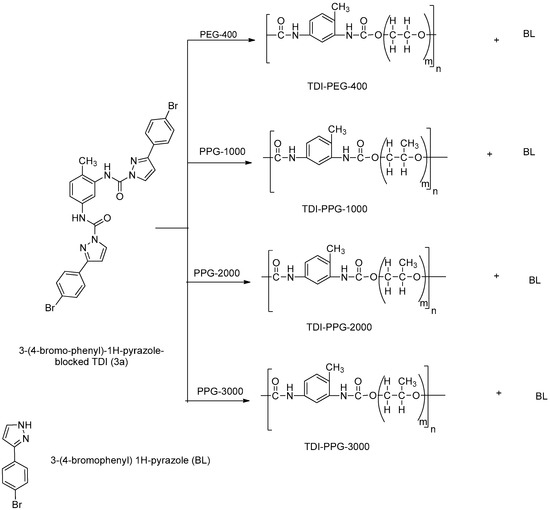 Toluene diisocyanate (TDI) was reacted with 3-(4-bromophenyl)-1H-pyrazole as a blocking agent to form blocked isocyanate adducts. NMR, IR, TGA and DSC were used to characterize the materials, and to investigate the deblocking temperature. At the deblocking temperature, regenerated toluene diisocyanate was reacted with polyols of different molecular weights to form polyurethane. Scheme 1 describes the blocking reactions of isocyanates with 3-(4-bromo-phenyl)-1H-pyrazole. Scheme 2 describes the reactions of blocked TDI with 3-(4-bromo-phenyl)-1H-pyrazole with polyols.