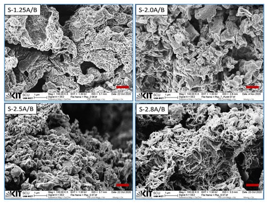 The morphological characteristics of all Pbp samples as-prepared under different APS/BP molar ratios are shown in Figure 2. The SEM image of as-synthesized S-1.25A/B shows the appearance of a spongy, coral-like morphology. When the APS/BP molar ratio is increased, clustered microparticles with irregular shape and different sizes appear in the polymer samples S-2.0A/B and S-2.5A/B. The agglomeration and crosslinking of the particles, which form a non-uniform, clump-like morphology, make it difficult to identify the shape and size of the microparticles. However, the agglomeration is more pronounced in S-2.0A/B compared to S-2.5A/B. Numerous gaps of different sizes can be seen in the microstructure. For S-2.5A/B, the surface of the larger agglomerates is covered with smaller nanosized particles with a broad distribution ~80–350 nm. Towards a higher APS/BP molar ratio (2.8), interconnected, fused, and short nanostructures (with an average diameter of 40–100 nm) appeared in S-2.8A/B together with irregular agglomerates. Thus, the morphology showed a great dependence on the APS concentration. Such morphological changes with changes in the amount of APS have also previously been reported for other polymers [7,29]. Although Pbp prepared with higher APS/BP molar ratio exhibited more regular nanostructured morphology, the high degree of overoxidation confirmed by FTIR cannot be neglected since it is known to have negative effects on the electrochemical activity (see Section 3.7).