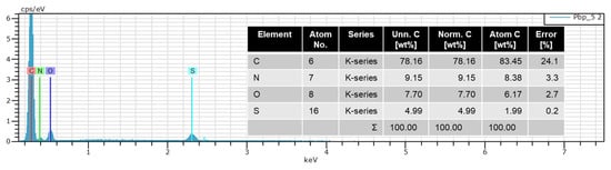 The SEM images of the Pbp samples with different concentrations of H2SO4 and DBSA are shown in Figures S3 and S4, respectively. Interestingly, the morphology of the Pbp changed from a spongy to compact appearance when the concentration of H2SO4 and the amount of DBSA were changed. Moreover, the microparticles showed variations in size and extinction of agglomeration of the particles. This could be due to the formation of polarons/bipolarons producing large particles and micelle fusion of the surfactant due to the varying amount of DBSA. Studies that have reported the effect of acid concentration and amount of surfactant on the morphology of the conjugated polymers also found a similar effect [15,25,29,30]. Figure 3 shows EDX analysis of the representative Pbp sample (S-2.5A/B). The presence of C, N, O, and S elements in EDX spectra confirms the successful incorporation of DBSA and H2SO4 in the Pbp backbone. The sulfur content varies with the stepwise variation in concentration of both H2SO4 and DBSA dopants during the synthesis. This is an indication of incorporation of sulfur from both the dopants. In addition, Pbp was prepared separately in aqueous medium using H2SO4 (without DBSA) and DBSA (without H2SO4) using 2.5 A/B mole ratio. The sulfur content due to H2SO4 and DBSA was found to be 3.69 and 4.14%, respectively. The value of sulfur content increased to 4.99% in the case of Pbp prepared in DBSA assisted aqueous H2SO4 medium. Moreover, the increment in carbon content from 72.02% for Pbp prepared with H2SO4 only to 78.16% in Pbp prepared with both H2SO4 and DBSA is ascribable to the incorporation of long carbon chain of DBSA. This indicates that both DBSA and H2SO4 dopants are incorporated in the Pbp. A similar study on synthesis of conjugated polymer with H2SO4 and sodium lauryl sulfate has been reported previously [31].