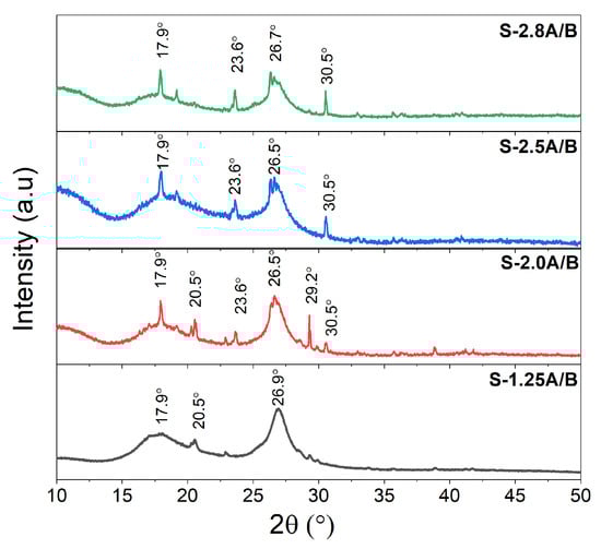 At a lower APS/BP molar ratio (1.25), two peaks are clearly seen at 2θ = 17.9 and 26.9°. The intensity of the characteristic peaks seems to increase with the increase of the APS/BP molar ratio up to 2.8. With the variation of the reaction parameters, the increase in peak height along with the appearance of additional peaks indicates the achievement of a more compact and regular arrangement of the molecules, which may have led to better electron transfer and intermolecular hopping of charge carriers. Another reason may be the production of longer conjugated polymer chains with the incorporation of DBSA counter anions per monomer unit. Previous literature has also noted the increase in crystallinity of Pbp-based polymers, and others to some extent, with the change in reaction conditions [35]. In contrast to the observations from FTIR (Figure S2a,b), no increase in the degree of oxidation was observed from the XRD patterns with the increase in the APS/BP molar ratio (up to 2.8).