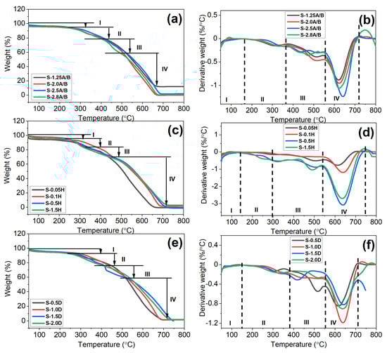 TGA and DTGA profiles of as-synthesized Pbp materials at different (a,b) APS/BP mole ratio (1.25–2.8) through varying benzopyrrole concentration, (c,d) H2SO4 concentration (0.05–1.5 M), and (e,f) DBSA concentration (0.5–2.0 mL).