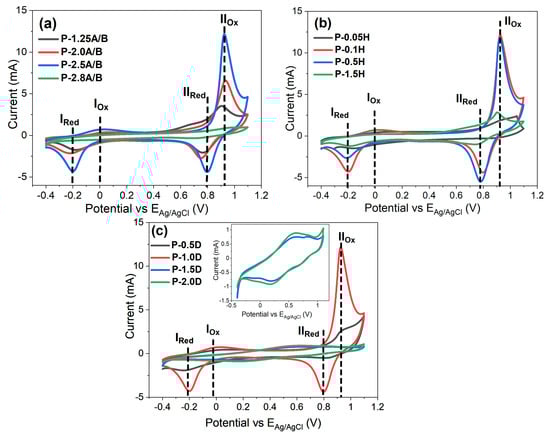 The variation in CVs with the change in APS/BP mole ratio, H2SO4 concentration, and DBSA amount can be seen in Figure 6. The potential window was kept between −0.4 and 1.1 V. All the CV plots exhibited pseudocapacitive nature, which can be clearly seen from the appearance of a sharp and quasi-reversible pair of characteristic oxidation-reduction couple (IOx/IRed and IIOx/IIRed) with alteration in their positions for various Pbp samples obtained under various reaction conditions which exhibit structural variations. This might be ascribed to the well-developed interaction between dopant’s counter ions and Pbp. Cyclic voltammograms with such redox couples are considered to form a stable cationic state of Pbp from a delocalized polar state by charge carrier conversion [7,32].