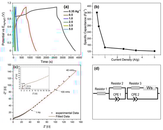 The capacitive performance of Pbp@HD in a symmetric two-electrode configuration is assessed by measuring CV (at various scan rates) and GCD (at various current densities). As shown in Figure 8a, the CV curves were recorded in the potential window between −0.4 to 1.1 V at scan rates of 20–100 mV s−1. The current response of Pbp@HD increases with increments in scan rate. Furthermore, a slight deviation in the CV loop from the rectangular shape is confirming the pseudocapacitive nature of Pbp electrodes accompanied by double layer capacitance. Moreover, Pbp@HD exhibited non-triangular GCD plots at varying current densities from 0.5–5.0 A g−1 in the potential window of 0–1.1 V (Figure 8b). Such deviation from a perfect triangular curve is indication of the pseudocapacitive nature of Pbp@HD electrodes, which is also concluded from CV data. It is significant to note that with the rise in current density from 0.5–5.0 A g−1, the specific capacitance shows a decline from 405.5 ± 1.8 F g−1 (0.5 A g−1), 166.0 ± 2.0 F g−1 (1.0 A g−1), 151 ± 2.0 F g−1 (2.5 F g−1), 142.5 ± 1.5 F g−1 (3.5 F g−1), and 96.7 ± 1.0 F g−1 (5.0 F g−1) (calculated from Equation (4)). This is ascribed to the fact that at lower current densities, the electrolyte ions can deeply interact with the bulk of Pbp@HD and hence it takes a longer time for charging and discharging. On the other hand, ions interact only with the electrode surface, therefore the charge-discharge time is lesser which leads to small specific capacitance at higher current densities [48]. The results are displayed in Figure 8c.