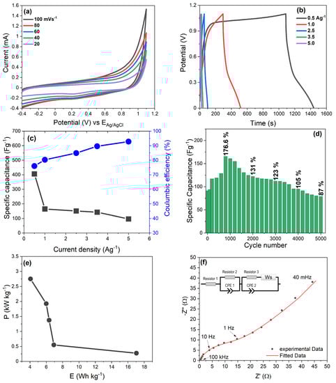 Energy density (E) and power density (P) are important in evaluating the manufactured Pbp@HD electrodes for successful application in supercapacitors. In the following, Equations (6) and (7) were used to calculate the gravimetric energy and power densities in a symmetrical two-electrode configuration. An inverse relationship between energy and power densities can be seen in the Ragone plot (Figure 8e). A maximum gravimetric energy density of 17 Wh kg−1 was achieved at a power density of 275 W kg−1 at 0.5 A g−1. When the power density was increased to 5.0 A g−1, a reduced energy density of 4.1 Wh kg−1 at 2.75 kW kg−1 was still achieved. These values are higher compared to the previously reported neat Pbp of 2.11 Wh kg−1 and 135 W kg−1 (1 Ag−1) [32].