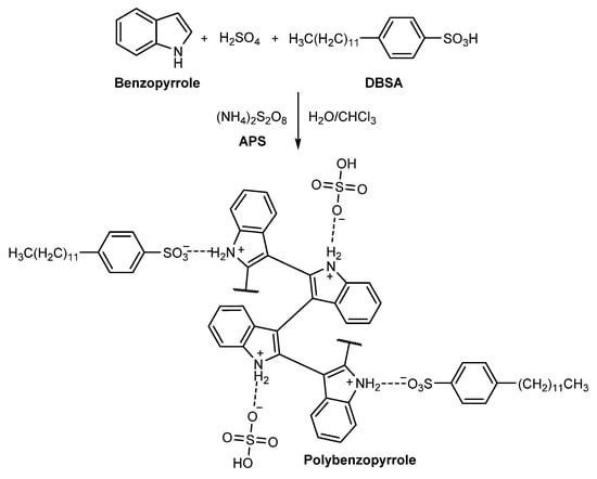 Benzopyrrole (C8H7N, >99%), dodecylbenzenesulfonic acid (DBSA, >95%), ammonium persulfate (APS, >98%), acetone (99%), and chloroform (>99.8%) were purchased from Sigma Aldrich (St. Louis, MI, USA). Toluene and sulfuric acid (H2SO4, 98%) were obtained from Scharlau (Barcelona, CAT, Spain). 2-Propanol and dimethyl sulfoxide (DMSO) were purchased from Daejung (Seoul, Korea). All the chemicals were of analytical grade and were used as received. Millipore deionized water (>18 MΩ) was used throughout the experimental work.
