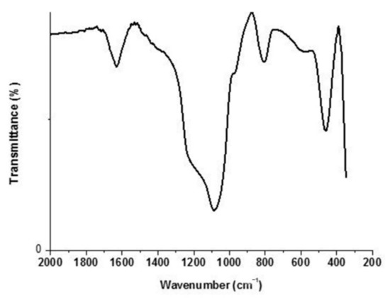 SiO2 NPs were prepared by adding 6 g sodium metasilicate to (394 mL) distilled water in a flask. The temperature was adjusted to 55 °C under constant stirring at a 300 rpm speed. CTAB (4 g) was added with stirring until complete dissolution for 15 min. The diluted HCl (200 mL) was added dropwise to the solution in two steps. In the first step, HCl was added dropwise to the mixture until the pH reached 9–9.5. With no further addition of HCl, the solution was agitated for another 10 min. More HCl was added until the pH reached 3–3.5 in the second step. Then, 10 mL of 10% NaCl aqueous solution was added to the reaction mixture at the acquired pH and agitated for an additional 20 min. The precipitated wet-gel silica was aged at 50 °C for 24 h, and the produced wet-gel silica was centrifuged and rinsed with distilled water until a negative response for chloride ions was observed, as measured with a 0.1 M AgNO3 solution. The gel was dried at 40 °C via a microwave heating process. The total drying time was 70 min for each sample, applied seven times in an intermittent interval of 10 min. The dried gel was calcined at 650 °C for 3 h in a muffle furnace to obtain the white powder of nano SiO2 [31,32]. The obtained micrographs showed that the SiO2 NPs size was in the range of 10–40 nm, whereas their shape was spherical (Figure 1). Moreover, most SiO2 NPs had a uniform size, and no aggregation was observed in scanning electron microscopy (SEM) analysis (JEOL JSM-6510LB with field emission gun, Tokyo, Japan). On the other hand, IR spectra were obtained for KBr pellets on a JASCO 410 spectrometer (Jasco, Tokyo, Japan) with only selected absorptions recorded in the range of 2000–200 cm−1. Figure 2 shows that the peaks at 1020–1110 and 807 cm−1 are attributed to Si-O-Si a symmetric and symmetric stretching style, respectively [33].