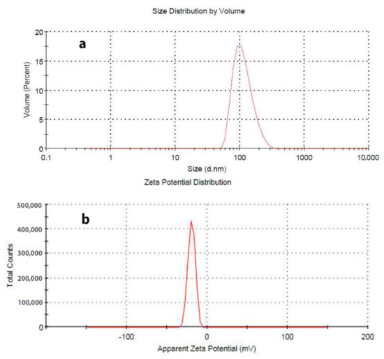 Dynamic light scattering (DLS) (a) and zeta potential (b) of the obtained SiO2 NPs.