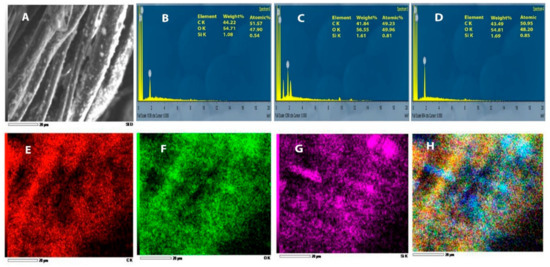 EDX spectrum of (A) SEM image (B) cotton/lycra (95.5/5.5%) fabric of 15 pick/cm, (C) cotton/lycra (90.8/9.2%) fabric of 19 pick/cm, and (D) cotton (100%) fabric of 22 pick/cm treated with SiO2 NPs, and EDX mapping of cotton/lycra (90.8/9.2%) fabric of 19 pick/cm corresponding to (E) carbon, (F) oxygen, (G) silicon, and (H) overlap at 20 µm bar scale.