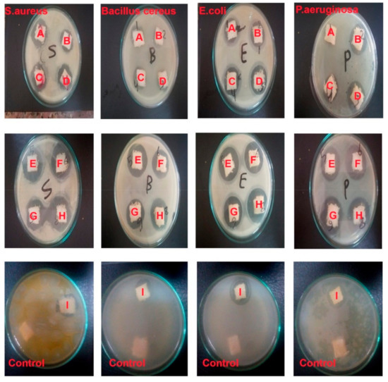 The antibacterial properties of treated and untreated samples are summarized in Table 3. Ciprofloxacin is used as a standard to correlate the lead samples from the series (4A–I). It is an antibiotic, causing the production of oxidative radicals and bacterial cell death [36]. The results indicated that the untreated samples were not affected, and there were no inhibition areas. On the other hand, the SiO2-NP/cotton/lycra composite fabrics exhibited excellent antibacterial activities against S. aureus, Bacillus cereus, E. coli, and P. aeruginosa compared with ciprofloxacin. This may be attributed to the fact that the mode of action of nanoparticles (NPs) is a direct interaction with the bacterial cell wall without the need to penetrate the cell. Most antibiotic resistance mechanisms can enhance the immunity of bacteria causing a lesser response to the antibacterial agent [37]. Samples E and G showed excellent activity against both Gram-positive and Gram-negative bacteria among all treated samples as compared to untreated samples. However, Sample (B) showed good activity against the four model bacteria. Samples (D) and (I) revealed good activity against both Gram-positive and Gram-negative bacteria in comparison to sample (A), which exhibited the lowest activity against Gram-negative (P. aeruginosa). Samples (F) and (H) showed good activity against the four model bacteria. However, sample (C) exhibited the lowest activity Gram-positive against (Bacillus cereus). In general, Samples (E) and (G) exhibited significantly high antibacterial activity compared to the all other samples in the series (4A–I) and with the standard. Additionally, the density of the pile 19 pick/cm is better than the other densities, as shown in Figure 6. This relies on the fact that there is more trapped air inside this structure (19 pick/cm) than in other densities. This trapped air helps in extending the zone of inhibition around the sample to 19 pick/cm, rendering it more resistant against bacterial attack. SiO2 NPs’ extraordinary antibacterial activity is attributed to their large surface area, which allows for better interaction with microbes [29].