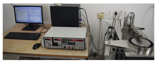 Wear tests were performed in ambient settings using a pin-on-disc tribometer procured from DUCOM, Bengaluru, India (Figure 2). To test the developed samples, and EN-31 disc with 62 HRC hardness and 0.11 µm roughness was used, as rotor discs in automotive brake systems are mostly prepared from grey cast iron and steel, owing to their exceptional damping capabilities and high resistance to wear and tear [21,22]. Tests were performed on a track with a diameter of 120 mm at 795 rpm, corresponding to a 5 m/s sliding velocity. Table 2 depicts the levels of parameters used for testing. Sliding velocity, sliding distance, and applied normal load are shown as Vx, Dy, and Fz, respectively, where x, y, and z represent the values of the parameters. In the present study, three average nominal contact pressures Pn—i.e., 0.21, 0.28, and 0.35 MPa—were studied equivalent to normal loads of 30, 40, and 50 N, respectively. These loads were selected to replicate low and moderate sliding wear circumstances for braking applications, wherein typical values of the product of contact pressure and sliding velocity vary from 0.3 to 20 MPa-m/s. Before each test, the disc was polished with emery paper and cleaned with acetone to maintain an even surface roughness value of 0.11 µm. Then, the sample was firmly clamped in the holder, and the tests were performed as described in the ASTM G99-17 standard. Three samples were tested for each configuration, and the average values are presented here.