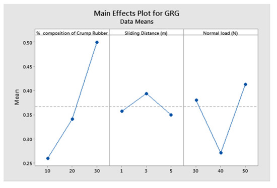 Table 8 shows that experimental number 8 has the highest GRG ranking which, in turn, expresses a better-quality characteristic. The combinations of experiment 8 were 30 vol.% of crump rubber, 3 km of sliding distance, and 50 N of normal load, which are considered to be optimal wear test parameters. The main effects plot plotted for the data means and GRGs is shown in Figure 3. The main effects plot acknowledges the optimal input parameters.