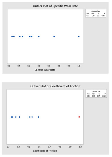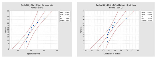 The ANOVA analysis explores the role of parameters on the effects of performance characteristics. The R2 and R2 (adj) values arrived at for the analysis were nearly 90%, which indicates that the proposed mathematical model is good [40]. The research work upholds the importance of the inclusion of crump rubber to minimize the wear rate. ANOVA analysis shows that the increased composition of crump rubber in the developed epoxy matrix plays a more instrumental role in improving the tribological properties than any of the other parameters. The majority of the contribution to influence both specific wear rate and coefficient of friction is from the crump rubber composition. The wear test parameters sliding distance and normal load were the least significant in this study. Figure 4 depicts outlier and normal probability plots where the points are linearly arranged, indicating the adequacy of the proposed model with a 95% confidence interval.