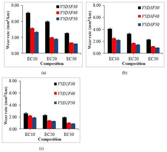 Tests were performed at a constant sliding velocity because load and sliding distance significantly affect the wear of samples compared with other parameters. The wear rates of crump-rubber-reinforced epoxy samples are depicted in Figure 5.