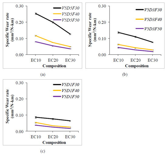 A decrease in the specific wear rate of all of the samples is seen with the increase in load. A substantial decrease is observed at EC-30, showing higher wear resistance at higher loads. A minimum specific wear rate of 0.02 mm3/N-km is observed with EC-30 in the V5D1F50 condition.